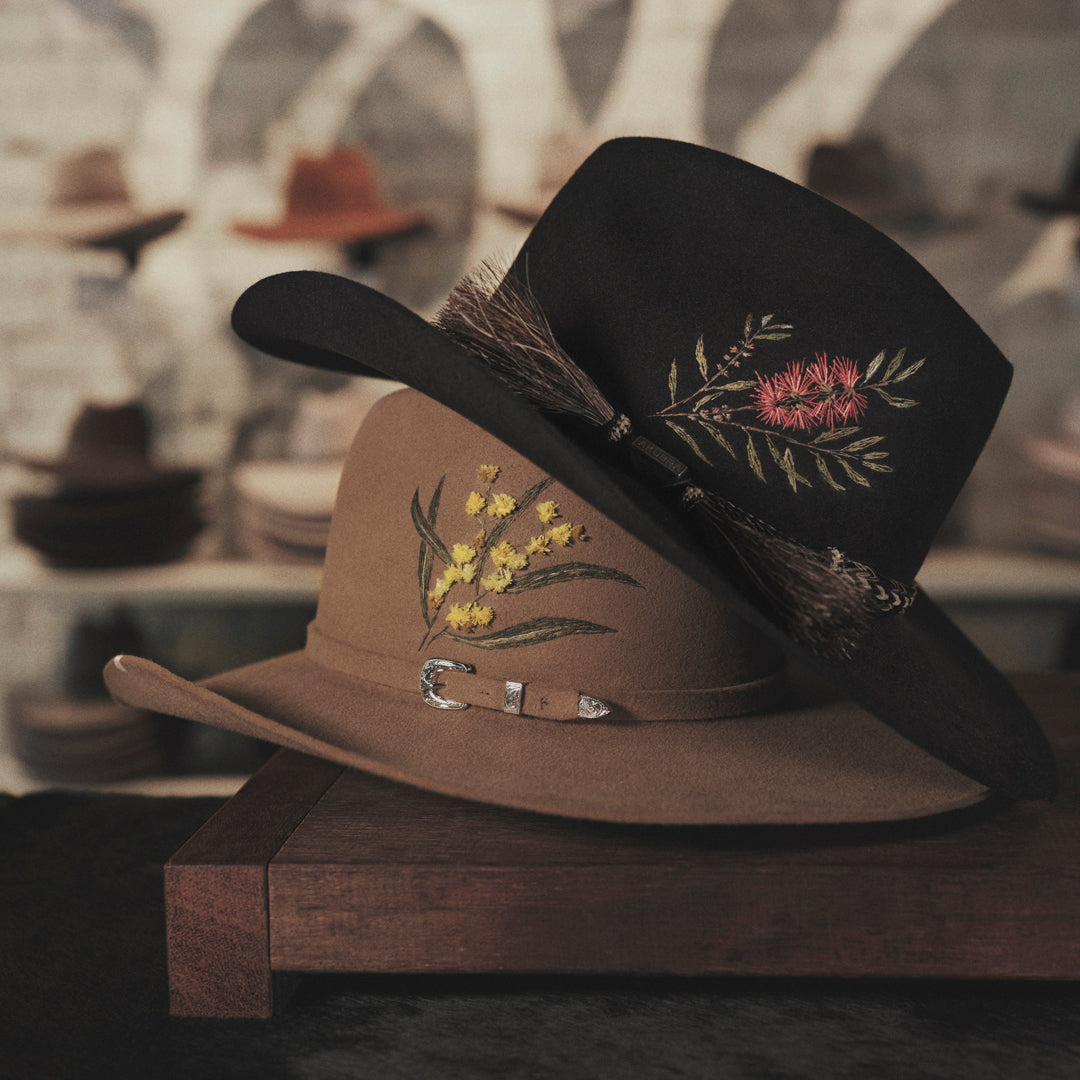 Handcrafted & Made To Order: Each hat is hand-embroidered by BxmBxm Hats and made to order, with a selection of three designs from The Wild Australia Collection (Wattle, Bottle Brush or Kookaburra). Embroidery is available only on brand-new Akubra hats. Each design is tied to a specific hat style only: